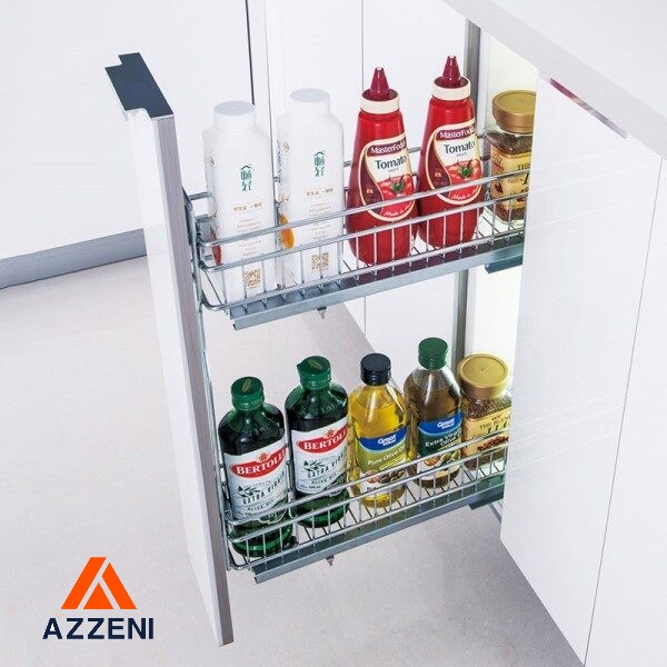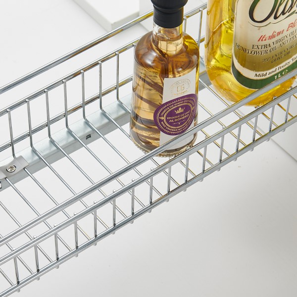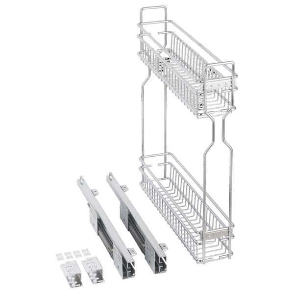 Excelente estante estrecho para cajón de cocina con extensión completa. Incluye estructura y cestas para instalar en sus armarios. Ideal para especias, botellas y otros artículos pequeños.