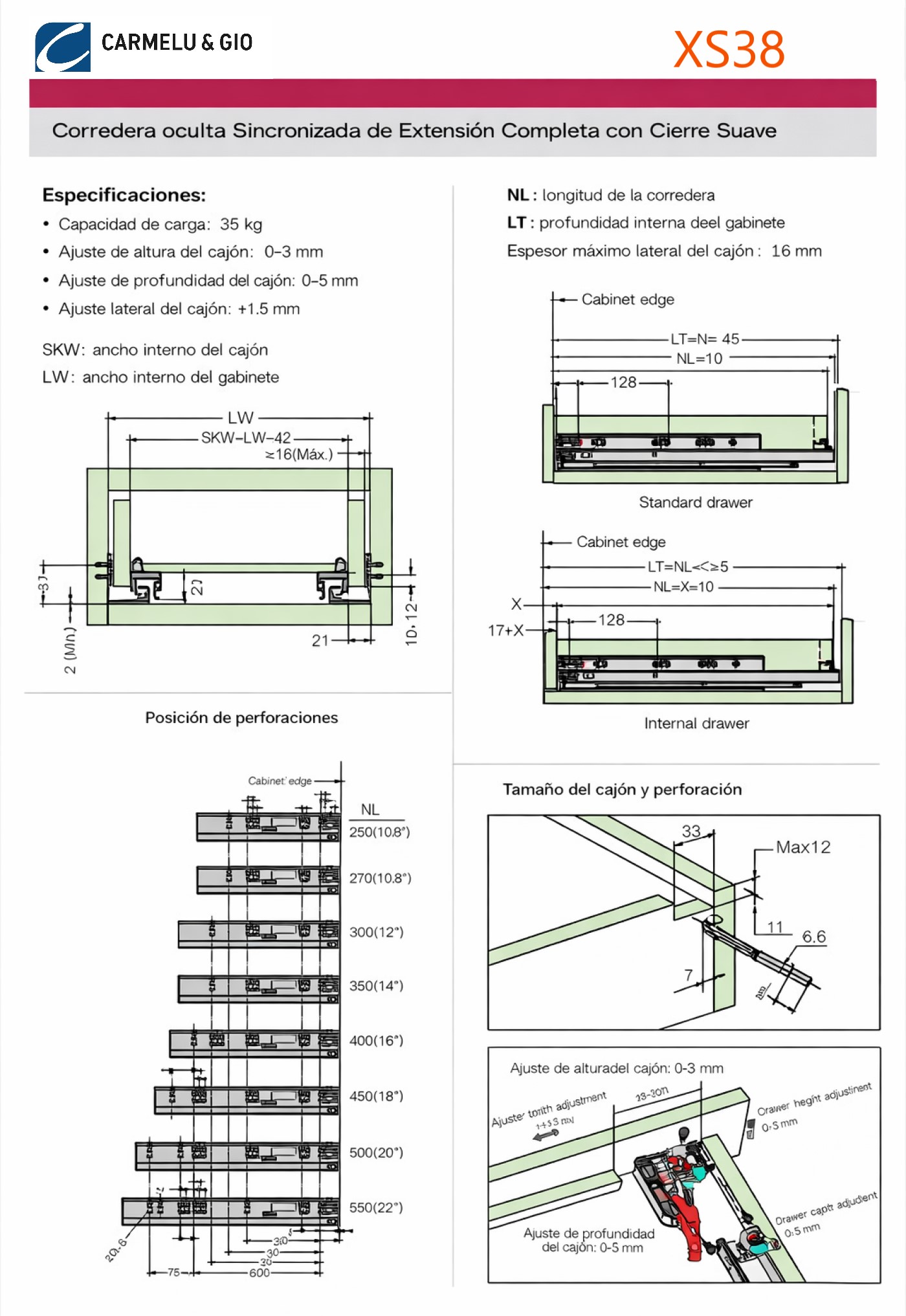La corredera oculta sincronizada AZZENI XS38 está diseñada para ofrecer un deslizamiento suave, silencioso y de alta precisión en cajones de muebles modernos . Extensión completa con clip 3D ajustable, para lateral máx. 16mm de ancho. Su diseño oculto permite mantener una estética limpia y elegante, ideal para cocinas, closets, mobiliario residencial y comercial.