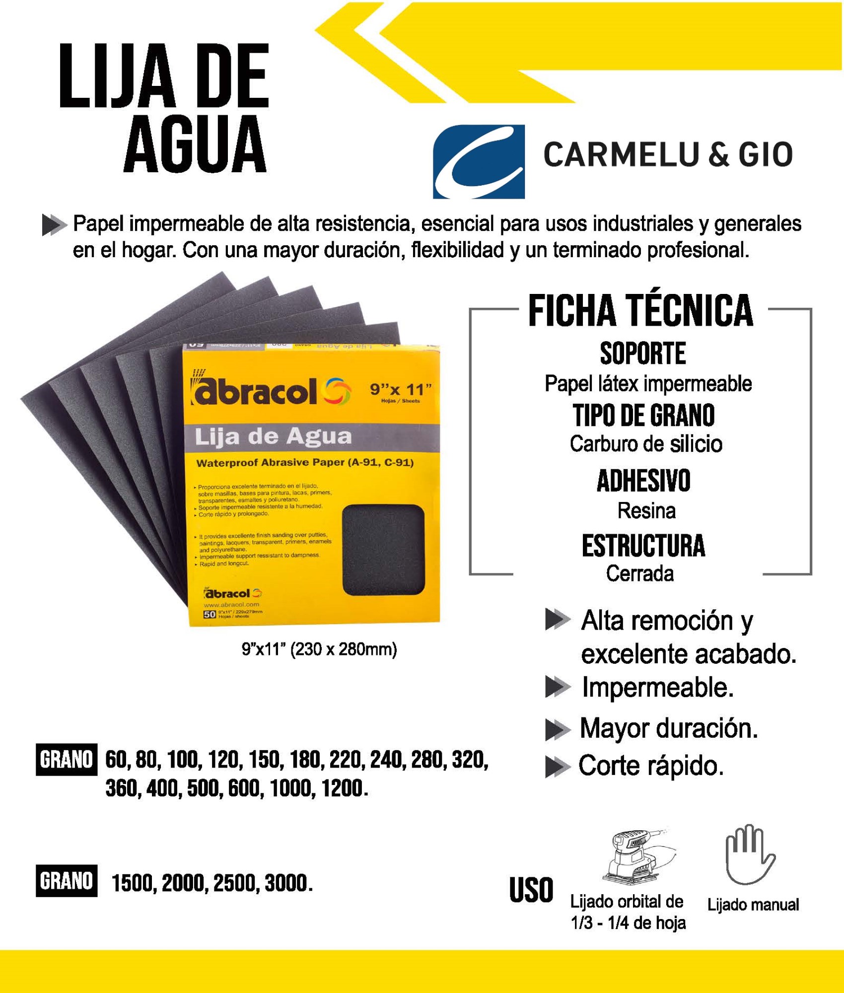 La lija de agua Abracol y 3M es un abrasivo de alto rendimiento, fabricado con papel impermeable y grano de carburo de silicio. Ofrece excelente durabilidad, flexibilidad y un acabado uniforme, ideal para trabajos en madera, pintura, lacas y metal. Puede utilizarse en seco o con agua para mejores resultados.